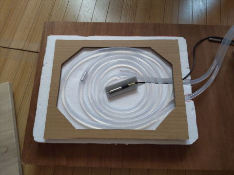 発砲スチロールの上に、ダンボールで 枠組みを作ります シリコンゴムのパイプをぐるぐる巻いて 敷設します 内径7mm 外形10mmのシリコンパイプ 真ん中に温度センサーを設置 |