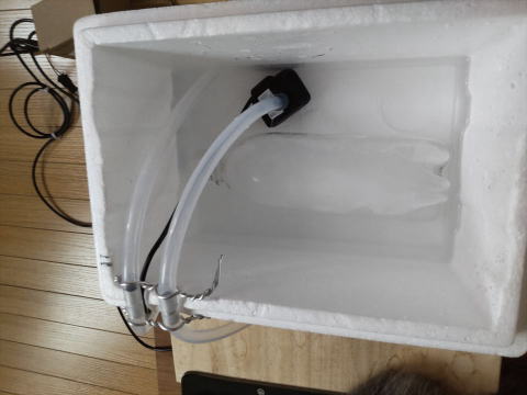 保冷用の発砲スチロールの箱に、 ポンプと、水、凍らせたペットボトルを 入れます |