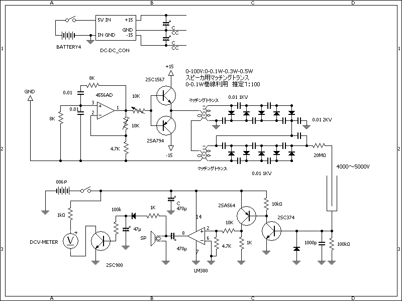 苦労したのは、コッククロフト回路で高圧を作った場合に高圧のリップルが多く、高電圧の為検出回路に漏れてくること